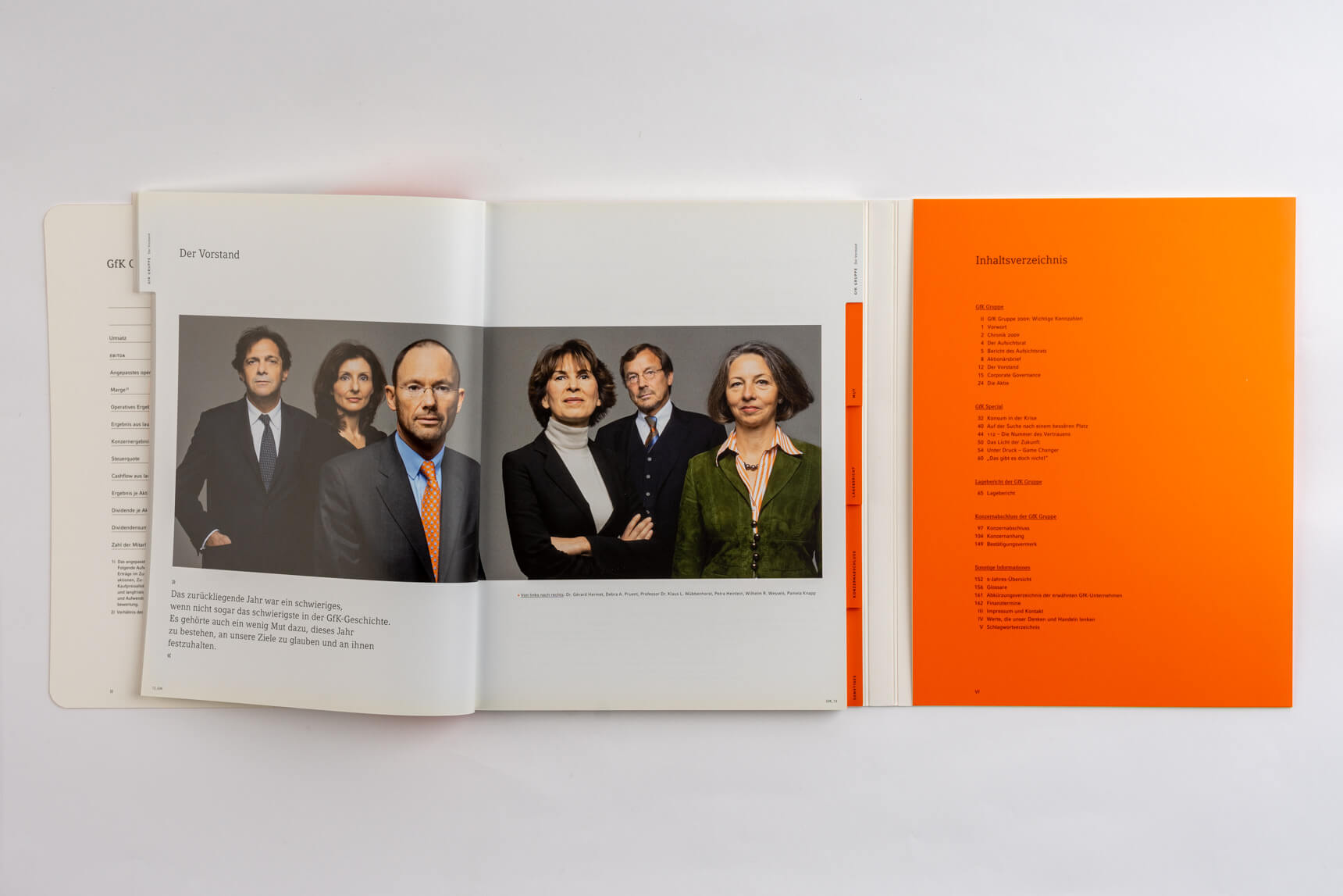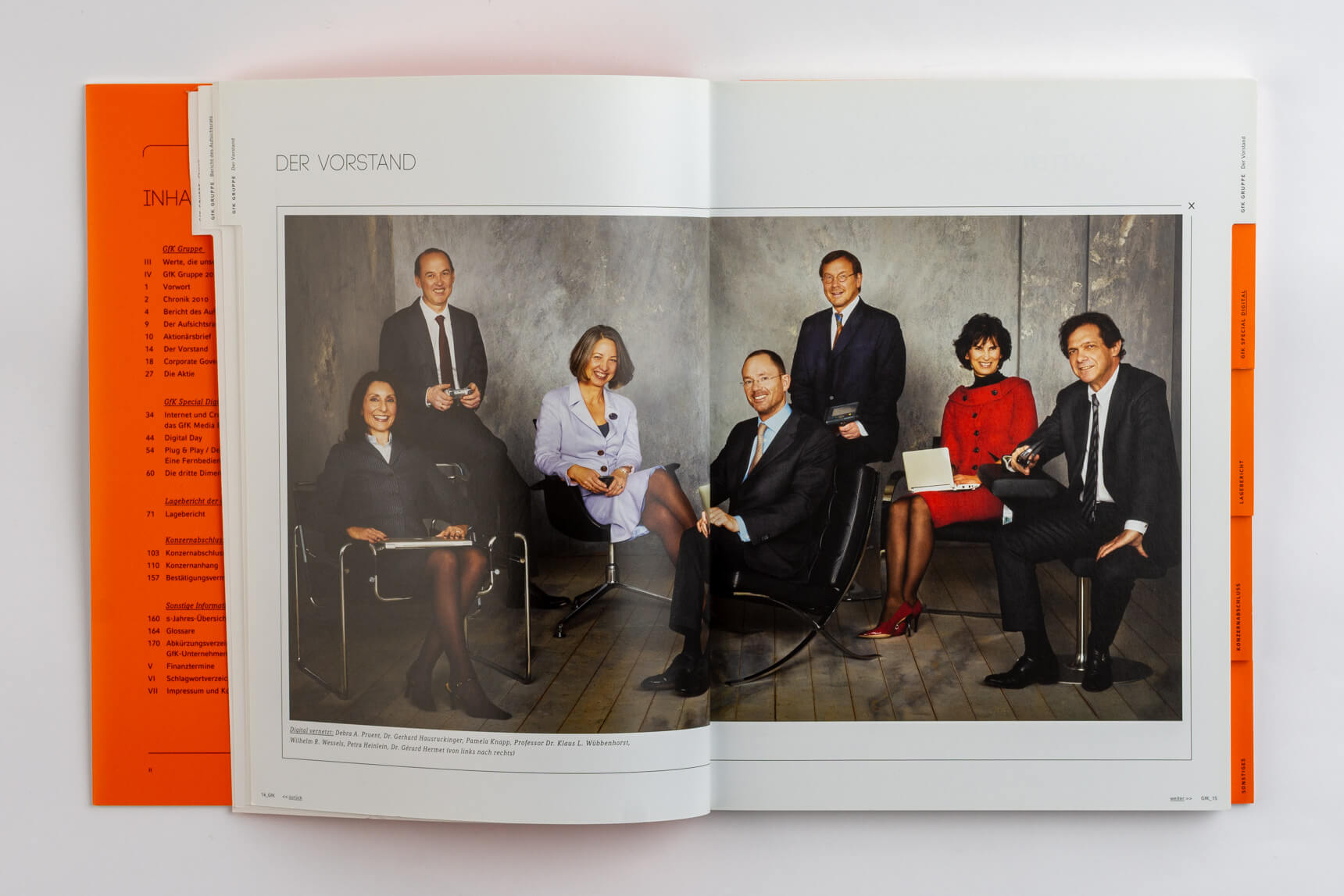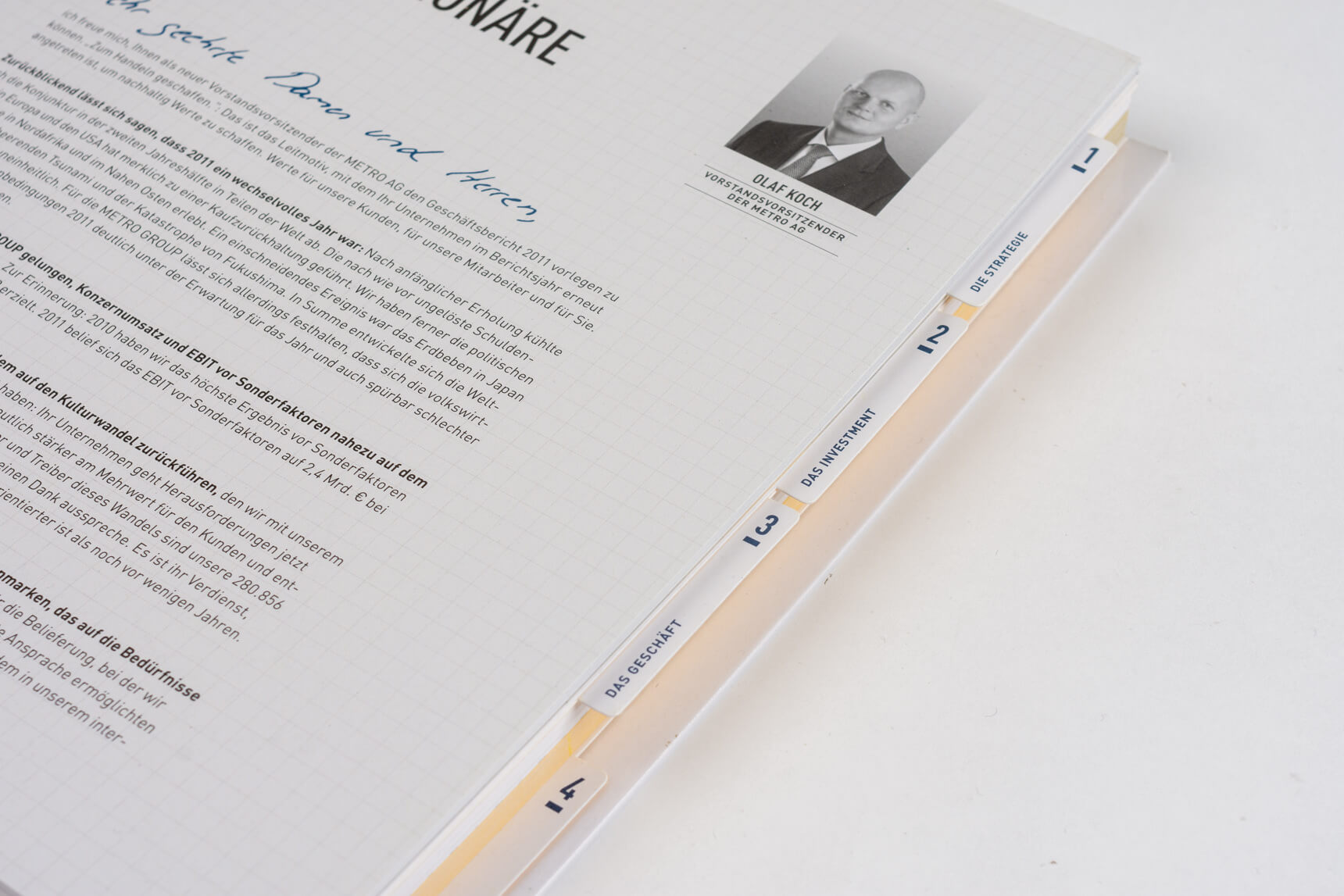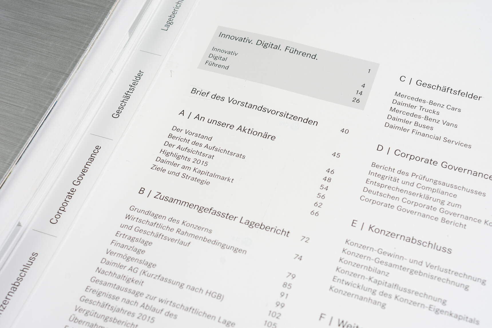 Metro 2011, Tabenregister. Siemens 2012, lebender Kolumnentitel. Daimler 2015, ausklappbares Inhaltsverzeichnis mit zusätzlicher Navigation im Bund. Deutsche Post DHL 2013, nach Buchstaben gegliederte Kapitel und Schnittregister.