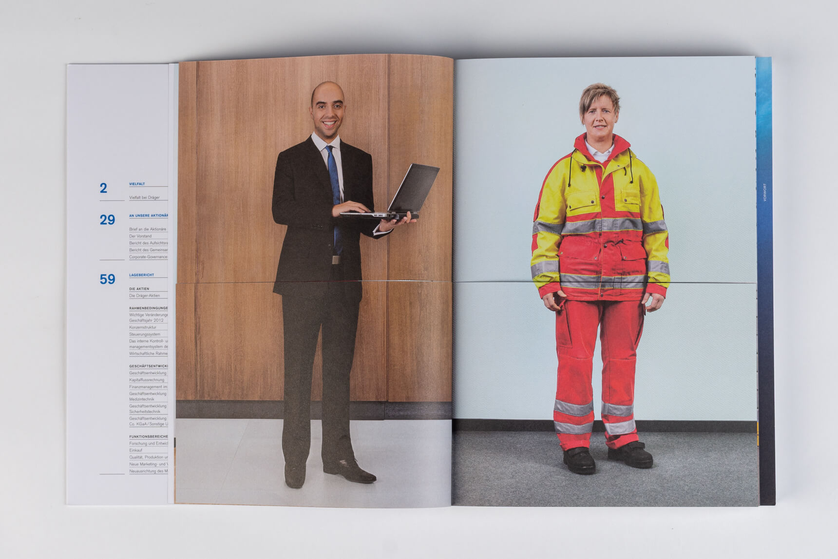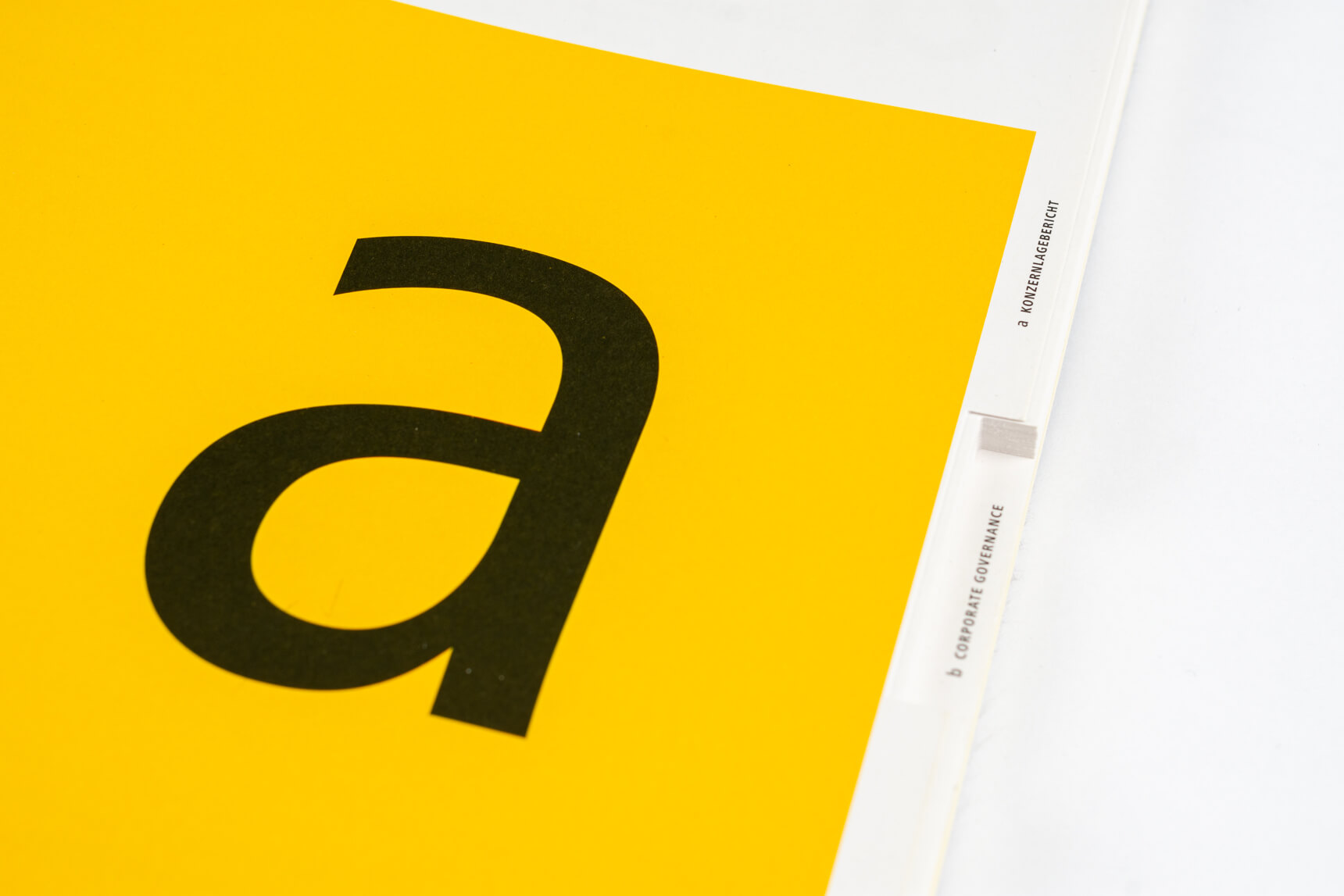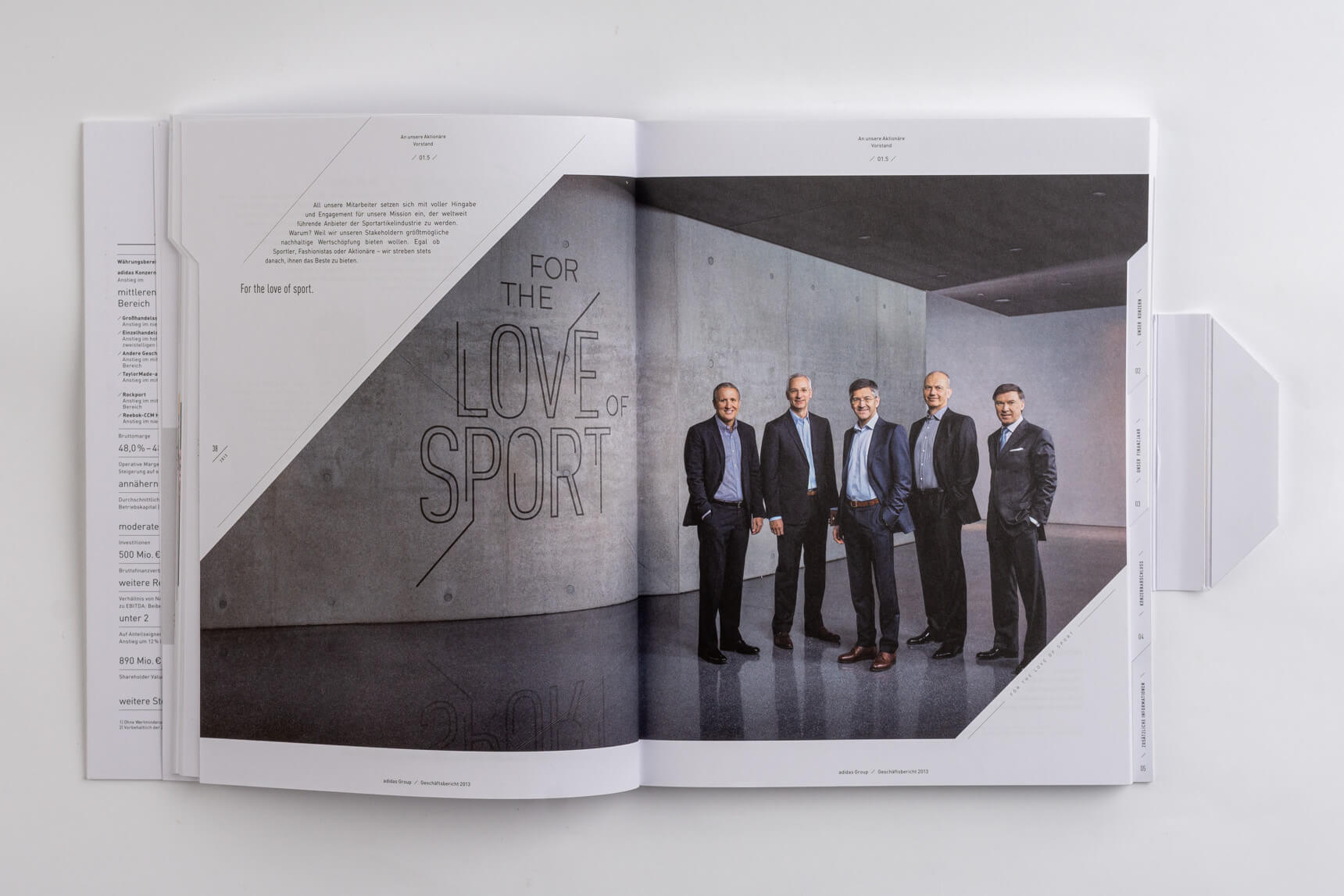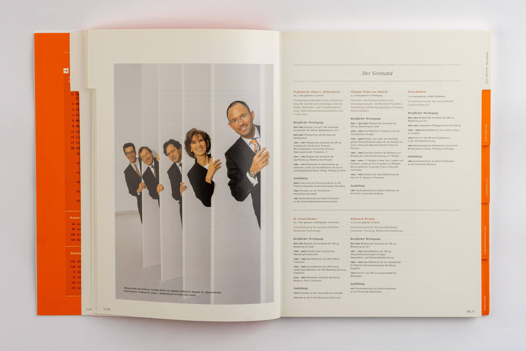 Metro 2011, Tabenregister. Siemens 2012, lebender Kolumnentitel. Daimler 2015, ausklappbares Inhaltsverzeichnis mit zusätzlicher Navigation im Bund. Deutsche Post DHL 2013, nach Buchstaben gegliederte Kapitel und Schnittregister.