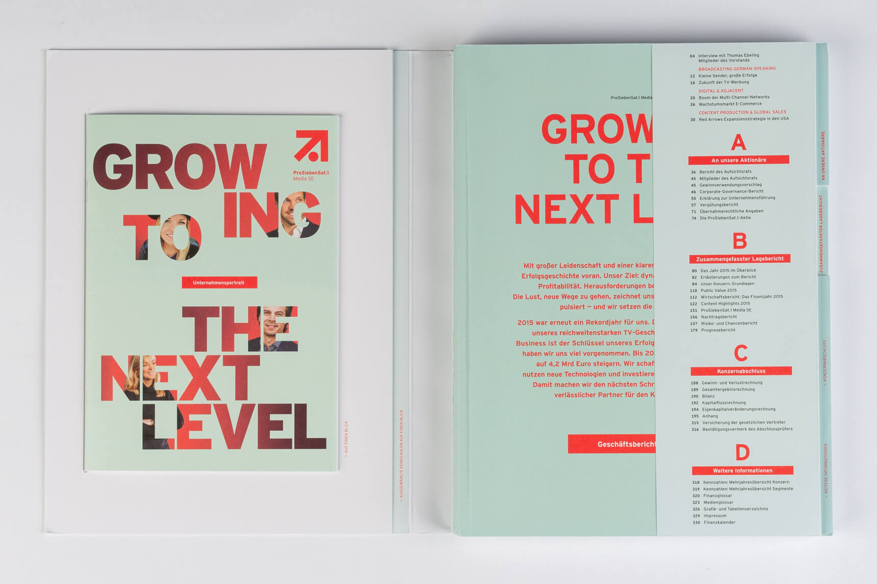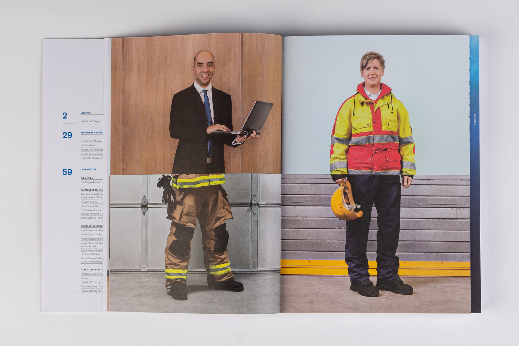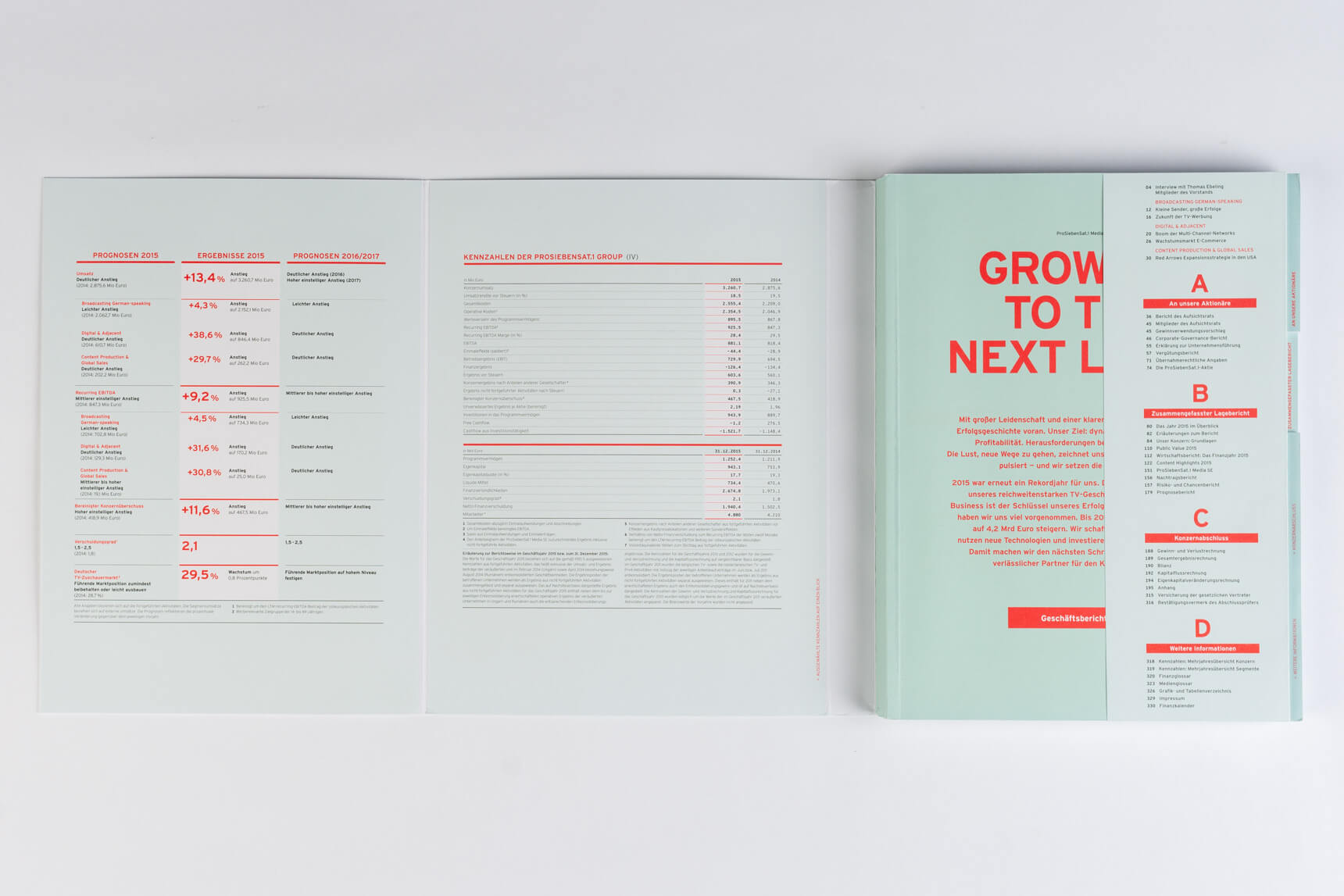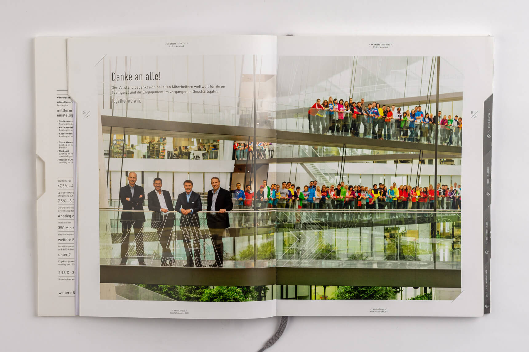 Metro 2011, Tabenregister. Siemens 2012, lebender Kolumnentitel. Daimler 2015, ausklappbares Inhaltsverzeichnis mit zusätzlicher Navigation im Bund. Deutsche Post DHL 2013, nach Buchstaben gegliederte Kapitel und Schnittregister.